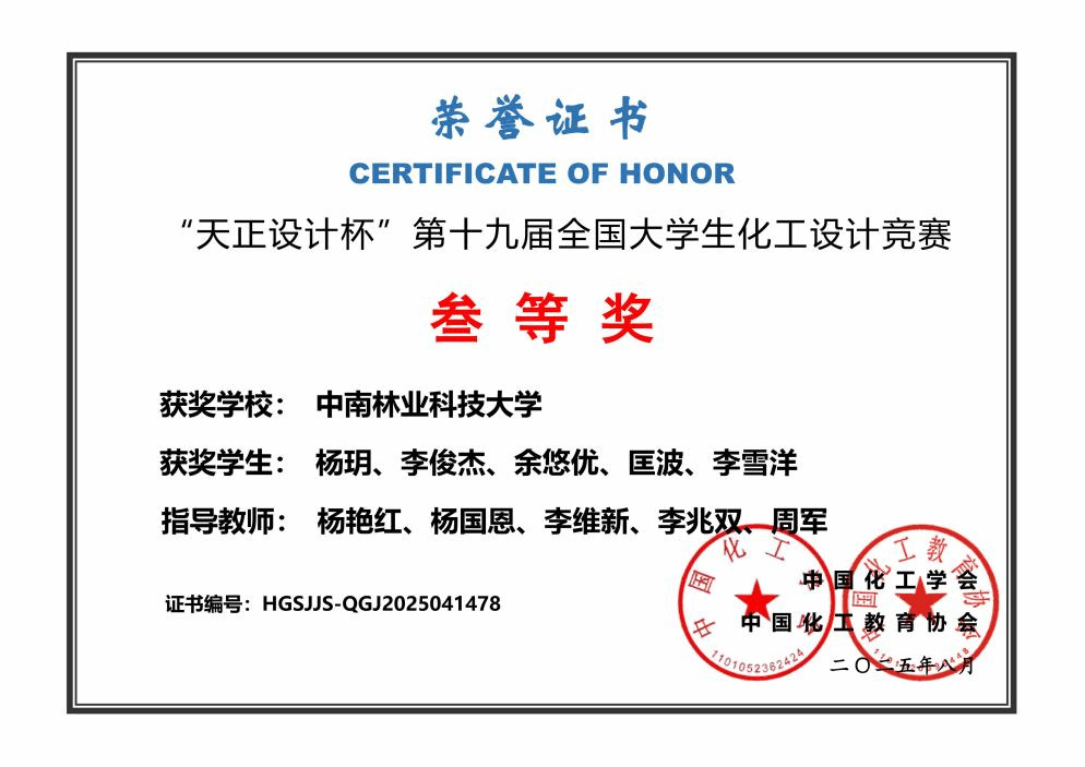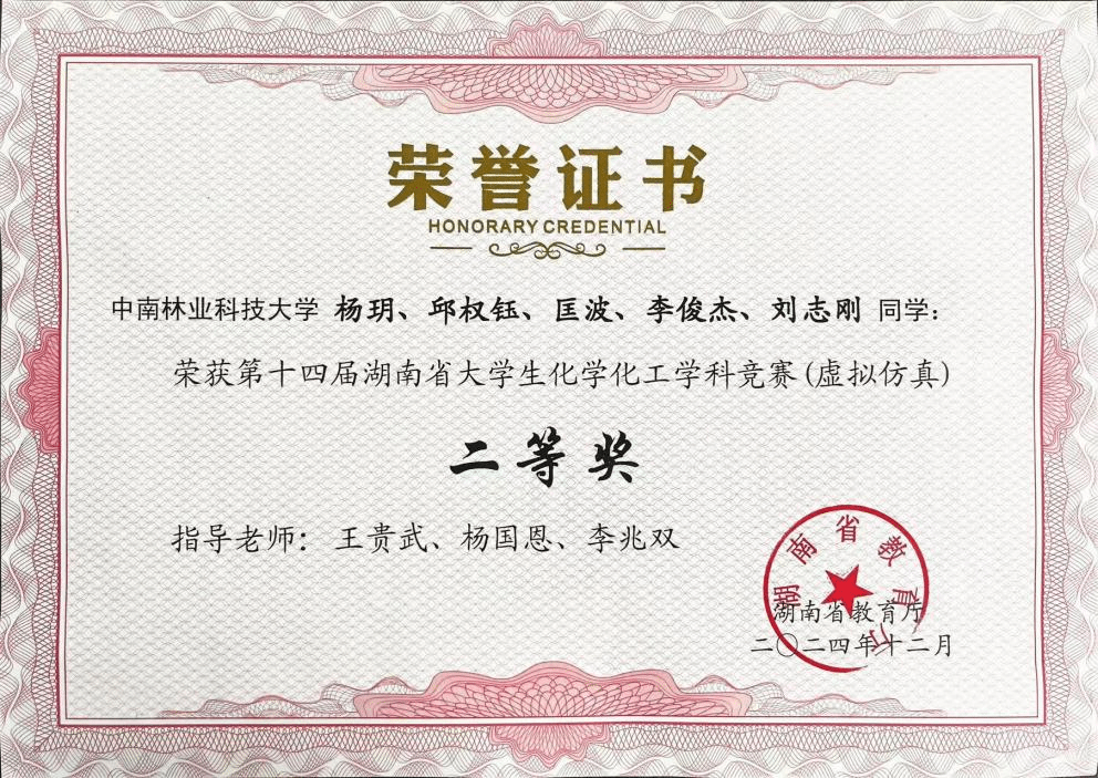 在科研与竞赛中,杨玥积极投身创新实践,追逐科学之光。她参与国家“十四五”重点研发计划项目,负责木质素结构鉴定工作,运用FTIR、NMR等先进技术为课题提供关键数据。作为项目第一负责人,她开展《基于油茶皂苷分离染料的浮选系统研究》,历经多次实验攻坚,最终以第一作者身份在期刊《Journal of Environmental Chemical Engineering》发表SCI论文。此外,她带领团队获湖南省大学生化学化工学科竞赛二等奖、全国大学生化工设计竞赛国家三等奖等多项荣誉,在实战中锻炼工程思维与协作能力。