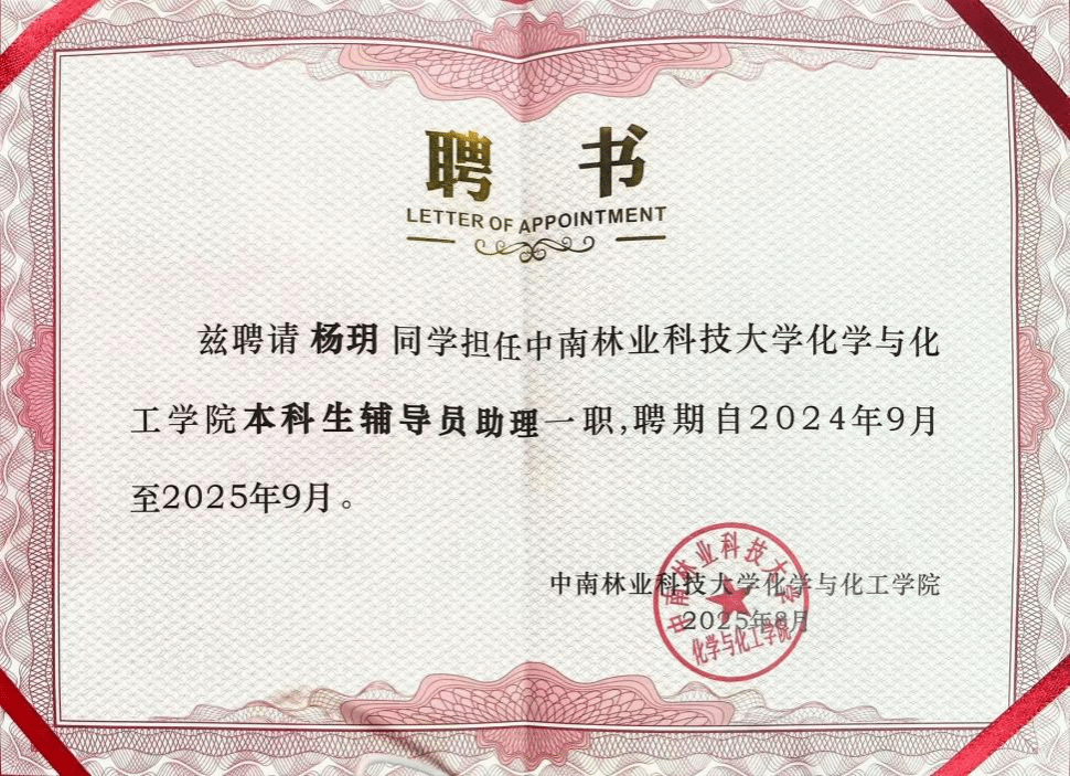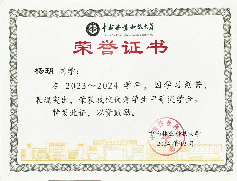学海无涯,唯勤是岸。杨玥始终将专业学习视为大学生活的重心,以不懈努力追逐知识的光芒。她课堂专注、课后深耕,系统构建林产化工学科体系,不仅扎实掌握《植物纤维化学》《林产化学工艺学》等核心课程,还主动拓展跨学科视野。目前,她的成绩位列专业第一,获得过国家奖学金、校级优秀学生甲等奖学金等,并一次性通过英语四六级,同时挑战自我通过德语四级,为未来国际科研合作铺就语言桥梁。