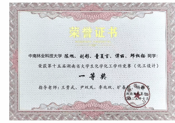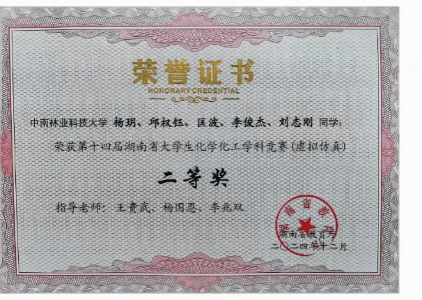 邱权钰深知理论与实践相结合的重要性,他积极参与科研项目和竞赛,将所学知识应用于实际。在科研竞赛中,他屡创佳绩,荣获第十九届全国大学生化工设计竞赛二等奖、第十九届湖南省大学生化工设计竞赛一等奖、第十八届湖南省大学生化工虚拟仿真竞赛二等奖等多项荣誉。这些经历不仅锻炼了他的科研能力,也激发了他对化工领域的浓厚兴趣。