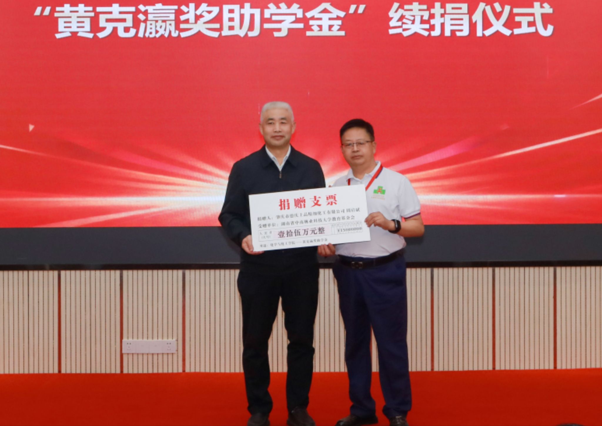 周启斌、李建昆再次向“黄克瀛奖助学金”分别捐赠15万元和10万元,继续奖励化学与化工学院品学兼优、创新创业成果突出的学生,资助积极向上的贫困学子。闫文德代表学校接受捐赠。