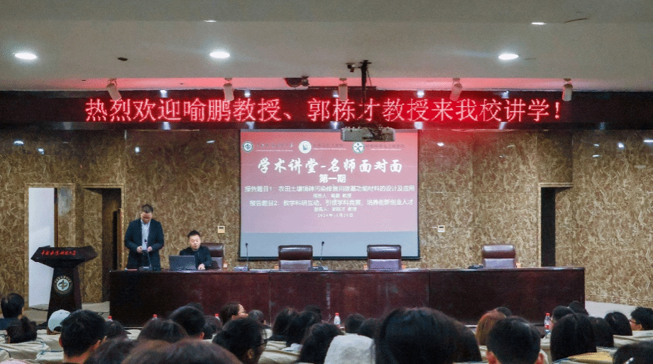 2024年11月20日,湖南大学郭栋才教授和湖南农业大学喻鹏教授应化学与化工学院邀请来我校作学术讲座。化学与化工学院副院长谢练武,副院长杨国恩,化工学院和材料学院骨干教师、研究生与本科生共200多人参加了学术报告会,会议由谢练武教授主持。