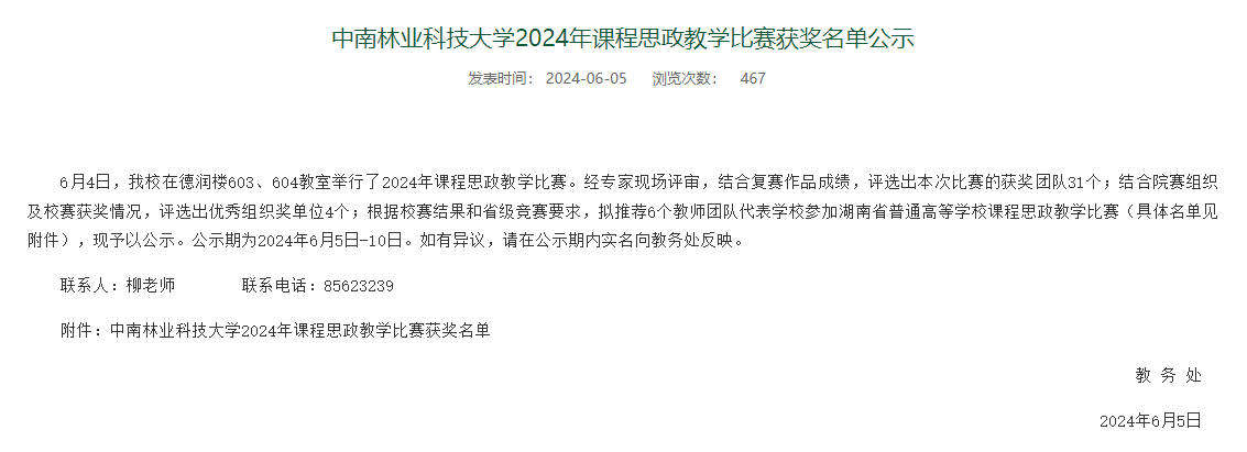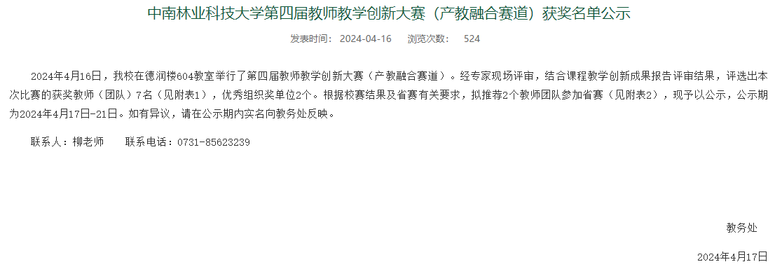 根据湖南省教育厅《关于举办2024年第四届湖南省普通高校教师教学创新大赛产教融合赛道赛事的通知》、《关于举办2024年第四届湖南省普通本科高校课程思政教学竞赛的通知》要求,学校先后组织进行了第四届教师教学创新大赛(产教融合赛道)、2024年课程思政教学比赛极省赛选拔赛,我院张胜团队、李培培团队、梁林富团队代表学院参加角逐,取得优异成绩,获得一等奖2项、三等奖1项、2个省赛参赛名额,为学院赢得2项优秀组织奖。